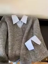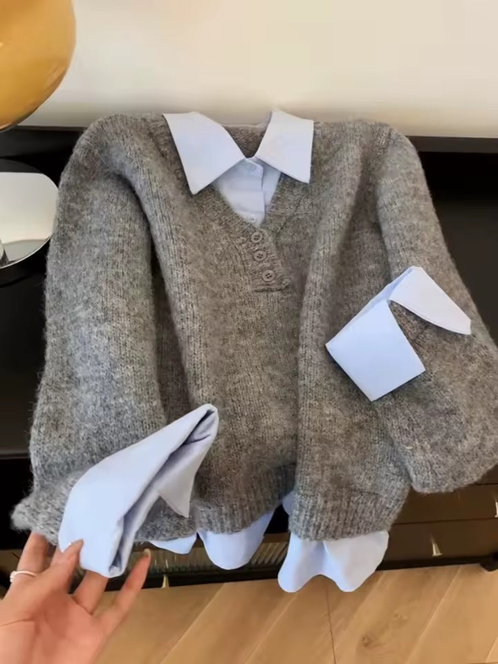 Stay stylish and cozy with this Korean-inspired layered knit sweater, featuring a turn-down collar and stacked two-piece illusion design. Lightweight yet warm, it’s perfect for spring and autumn casual wear. The soft knit fabric ensures comfort while the grey and blue contrast adds a modern touch. Ideal for everyday outings, office, or casual meet-ups, this layered sweater combines chic design with practical comfort.